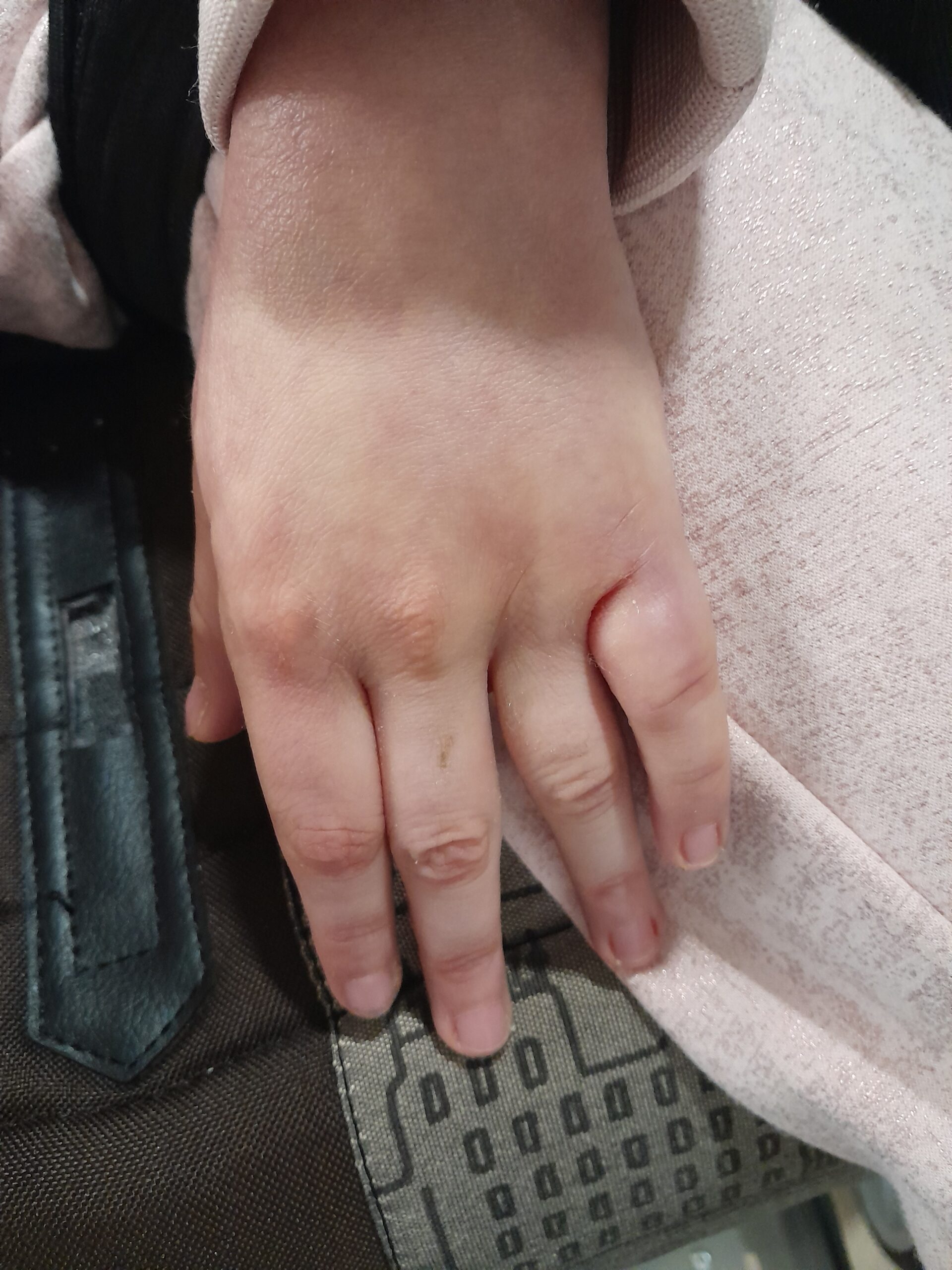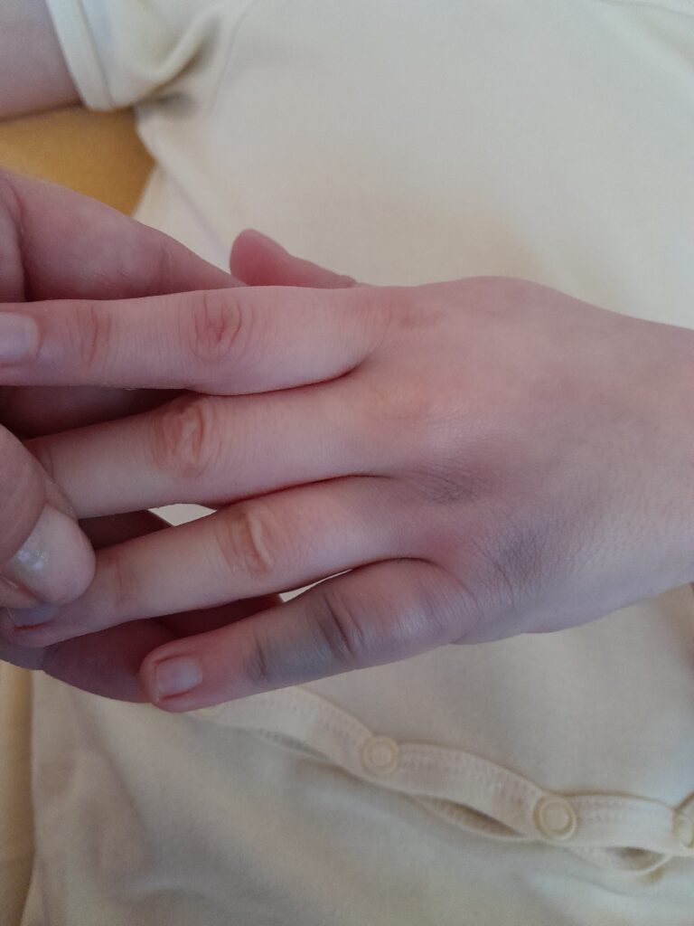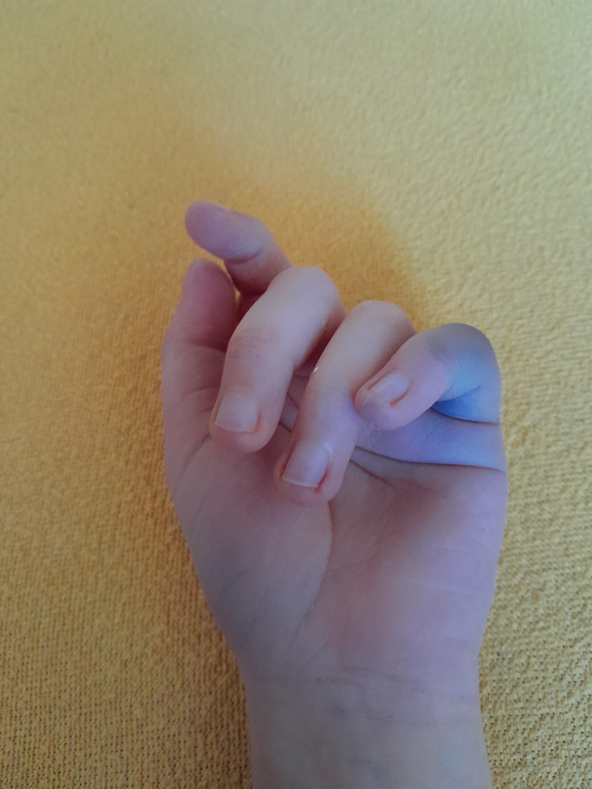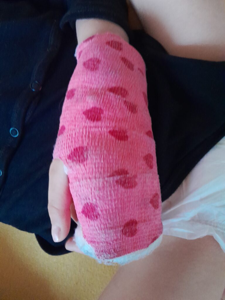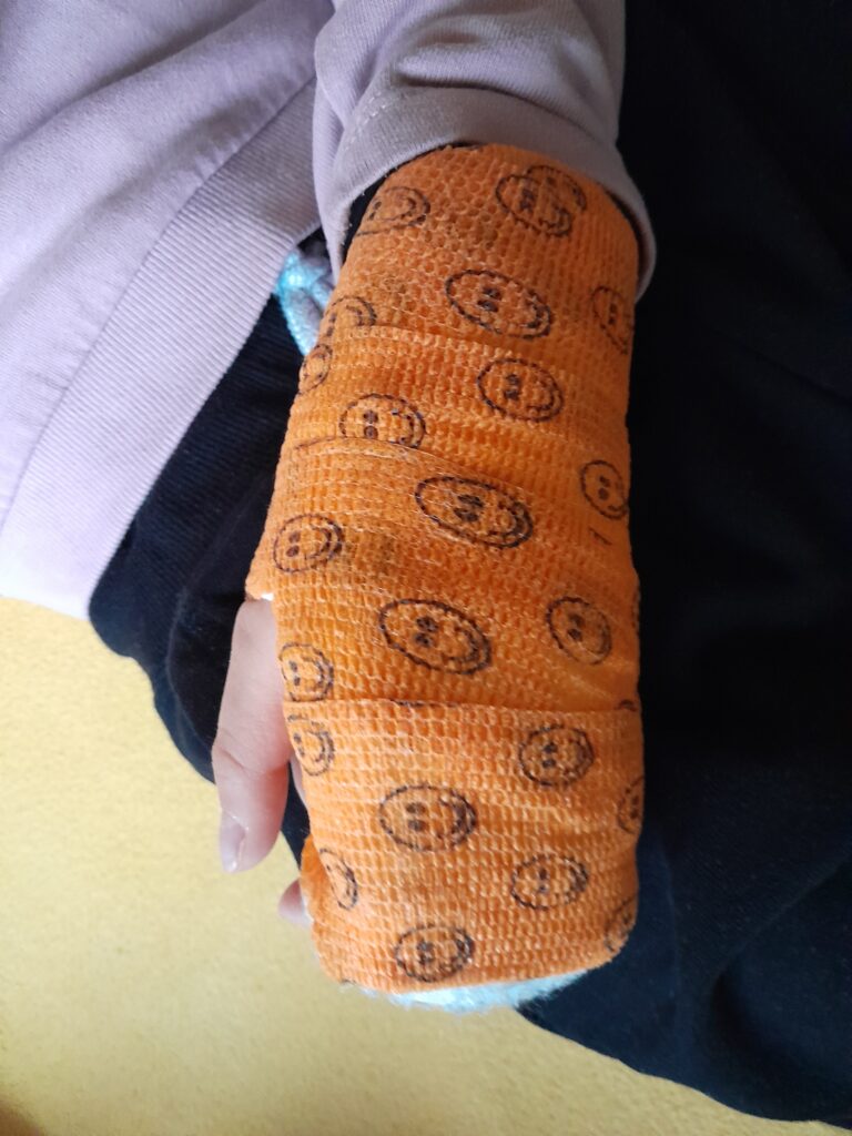 Nie wiem kiedy, nie wiem jak i gdzie, ale w sobotę rano, w moje urodzinki wstałam ze spuchniętą rączką :( Nie płakałam nic, więc mama myślała, że to tylko stłuczenie. W ruch poszły maści przeciwbólowe i altacet. Niestety, w poniedziałek nadal palce były opuchnięte i sine, więc pojechałyśmy do szpitala na prześwietlenie. I na rtg wyszło, że mam złamany palec. Decyzja lekarza – gips na dwa tygodnie.